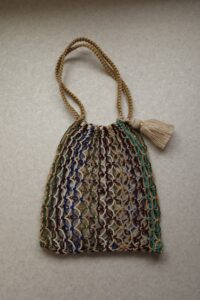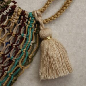 モロッコで手編みされた、軽やかなネットバッグ。 カラフルな糸を組み合わせた編み模様と、揺れるタッセルがさりげないアクセントになっています。中が透けるネット仕様で、中に入れるもの次第で表情が変わるのも魅力のひとつ。 コンパクトながらも、スマートフォンや財布、小物がしっかり収まるサイズ感。ちょっとしたお出かけや、バッグインバッグとしても活躍します。 重さ 155 kg サイズ 25 × 30 cm