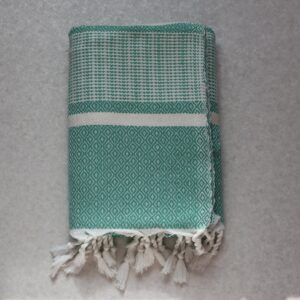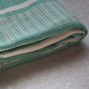 モロッコで織られた、軽やかな風合いのブランケット。 やさしいグリーンと生成りの組み合わせは、空間に自然と馴染みながら、ほどよいアクセントを加えてくれます。さらりとした肌触りで、季節を問わず使える一枚です。 ソファに掛けたり、ベッドの足元に置いたり、少し肌寒いときのひざ掛けとしてもおすすめ。タッセルの揺れが、空間にさりげない動きを生みます。 すべて手作業で織られているため、サイズや織りには個体差があります。それもまた、手仕事ならではの魅力です。 重さ 0.420 kg サイズ 190 × 90 cm