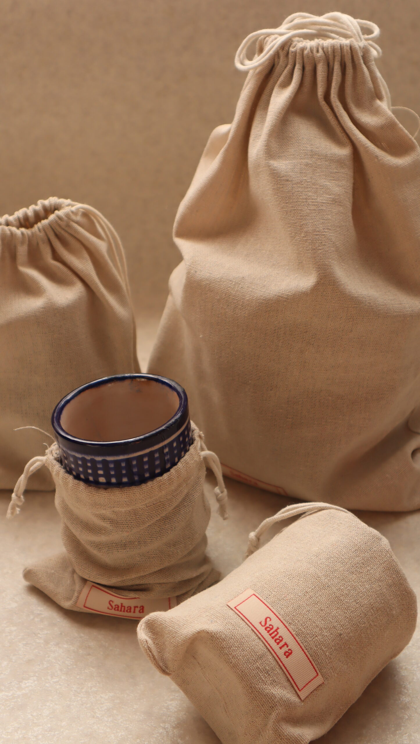 商品はすべて、オリジナルのコットン巾着に入れてお届けします。
